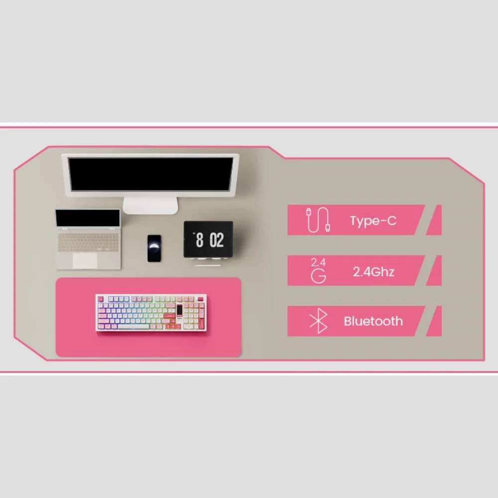 5098B Mechanical Keyboard with Screencan be connected to multiple devices through bluetooth 5.0, multi-host 2.4Ghz (with a receiver), and wired Type-C modes with easy switch.