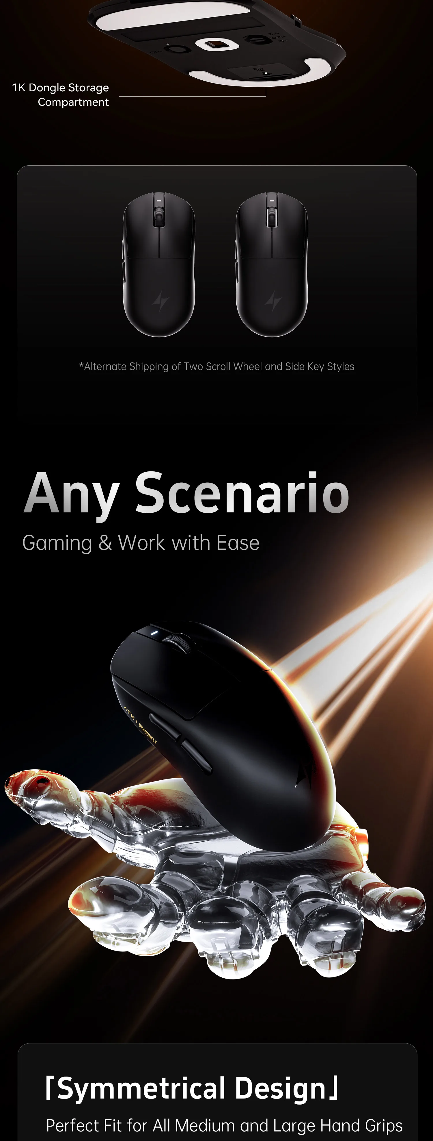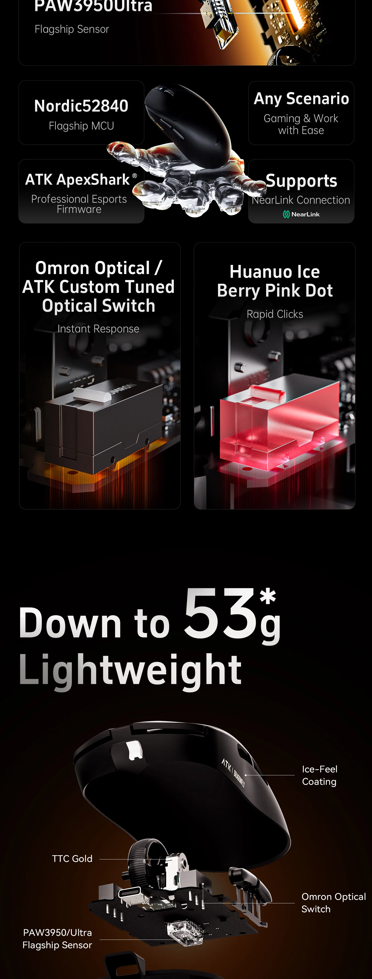 Powered by the high-performance Nordic 52840 MCU (available in select models), combined with Gen-2 SmartSpeed Wireless Transmission Technology and ATK ApexShark professional gaming firmware, it achieves an ultra-low 0.3993ms click latency, minimizing input lag and delivering a seamless control experience, giving you the edge in competitive gaming.