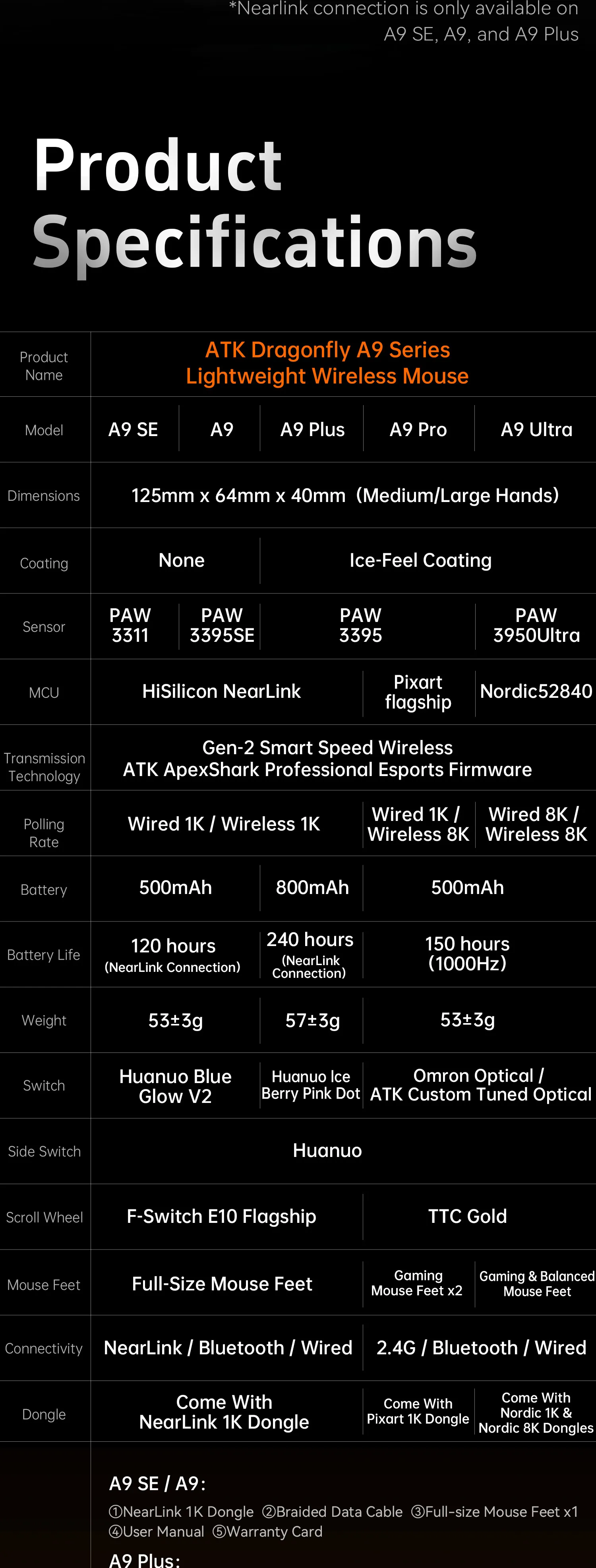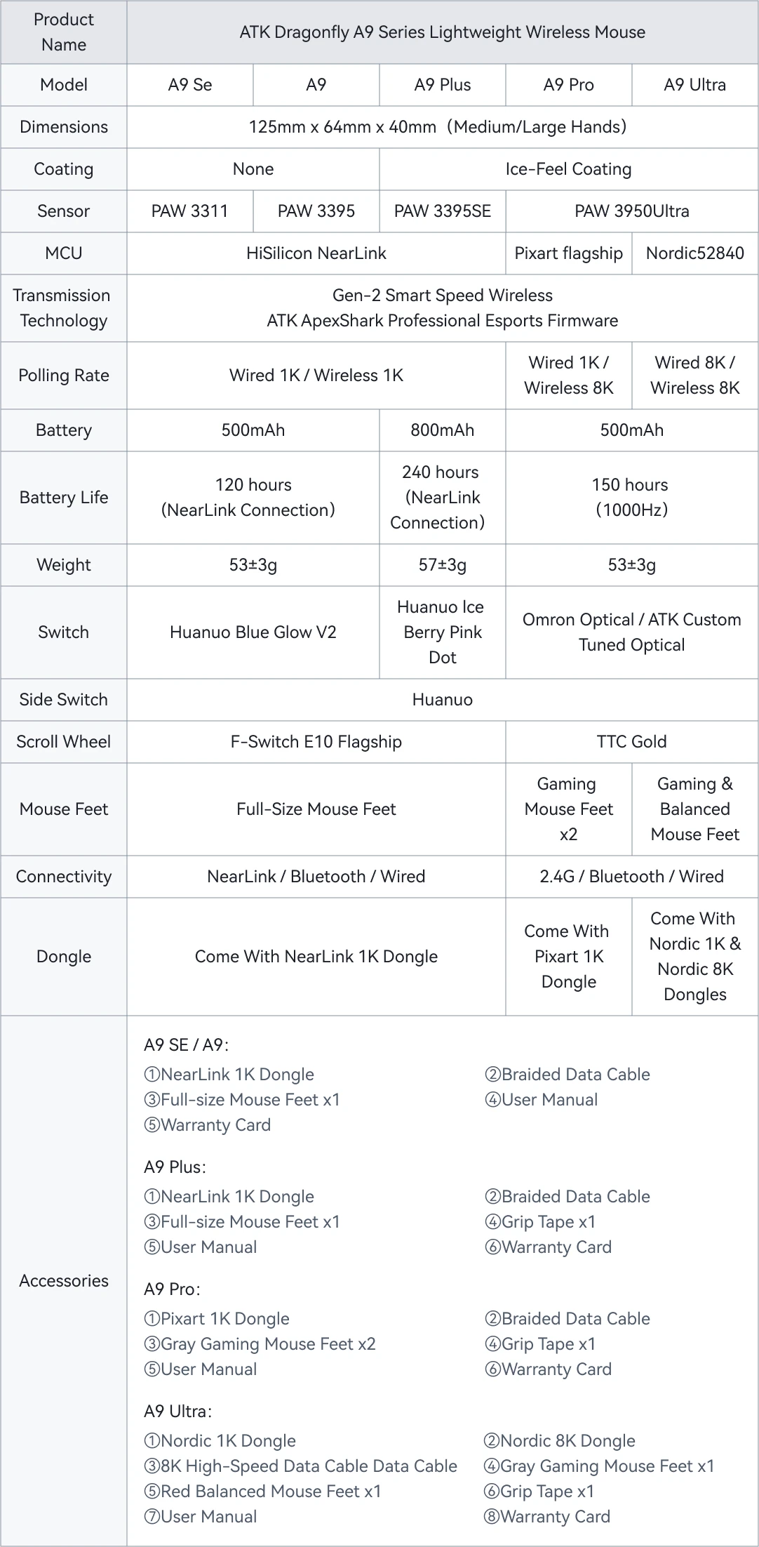 *The ATK Dragonfly A9 Series is designed for gamers with medium to large hands who demand speed, precision, and performance. Crafted with a classic mold, refined with hundreds of enhancements, a durable shell, flagship-level performance, and a smooth ice-feel coating, it provides a one-of-a-kind gaming experience. Whether you're competing in esports tournaments or handling daily tasks, the ATK Dragonfly A9 guarantees you a best-in-class experience.
