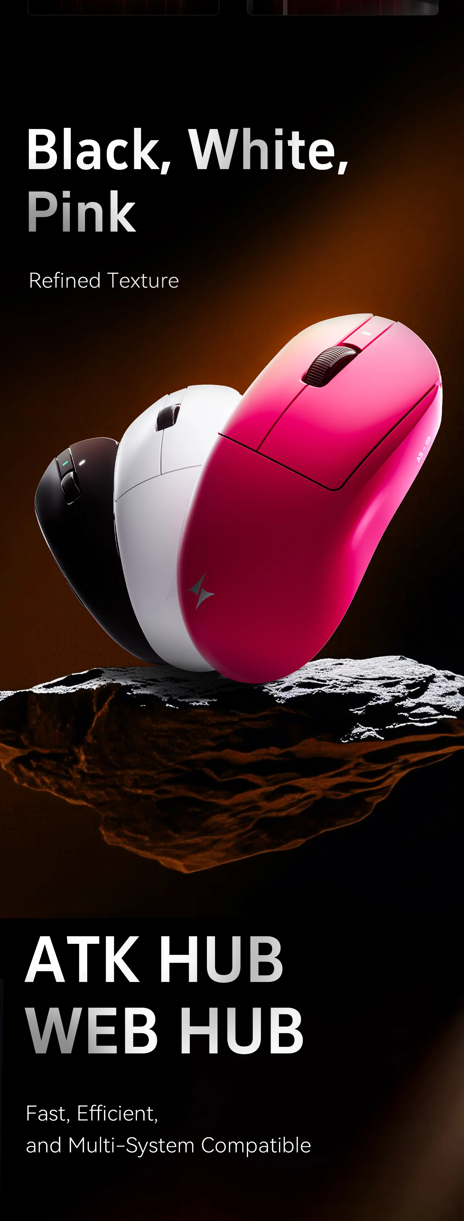 Supports ATK HUB software and WEB HUB online driver, offering DPI adjustment, polling rate settings, button remapping, macro programming, and firmware updates. Effortlessly fine-tune your mouse performance and unlock esports-level control for swift skill execution and dominance on the battlefield.