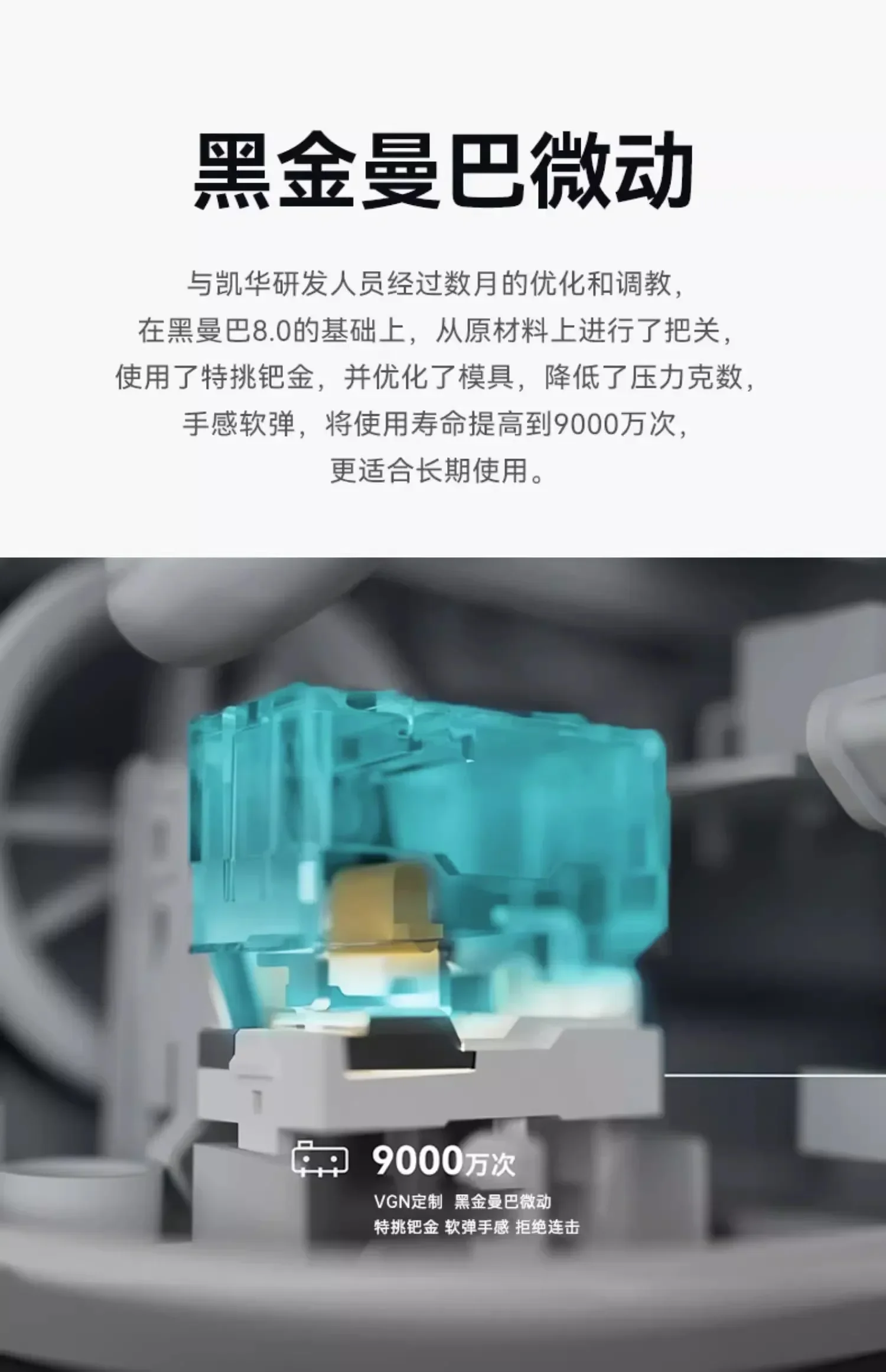 Trigger force: 40+10gf Trigger stroke: 1.4+0.4mm Bottom stroke: 3.5+0.3 mm.