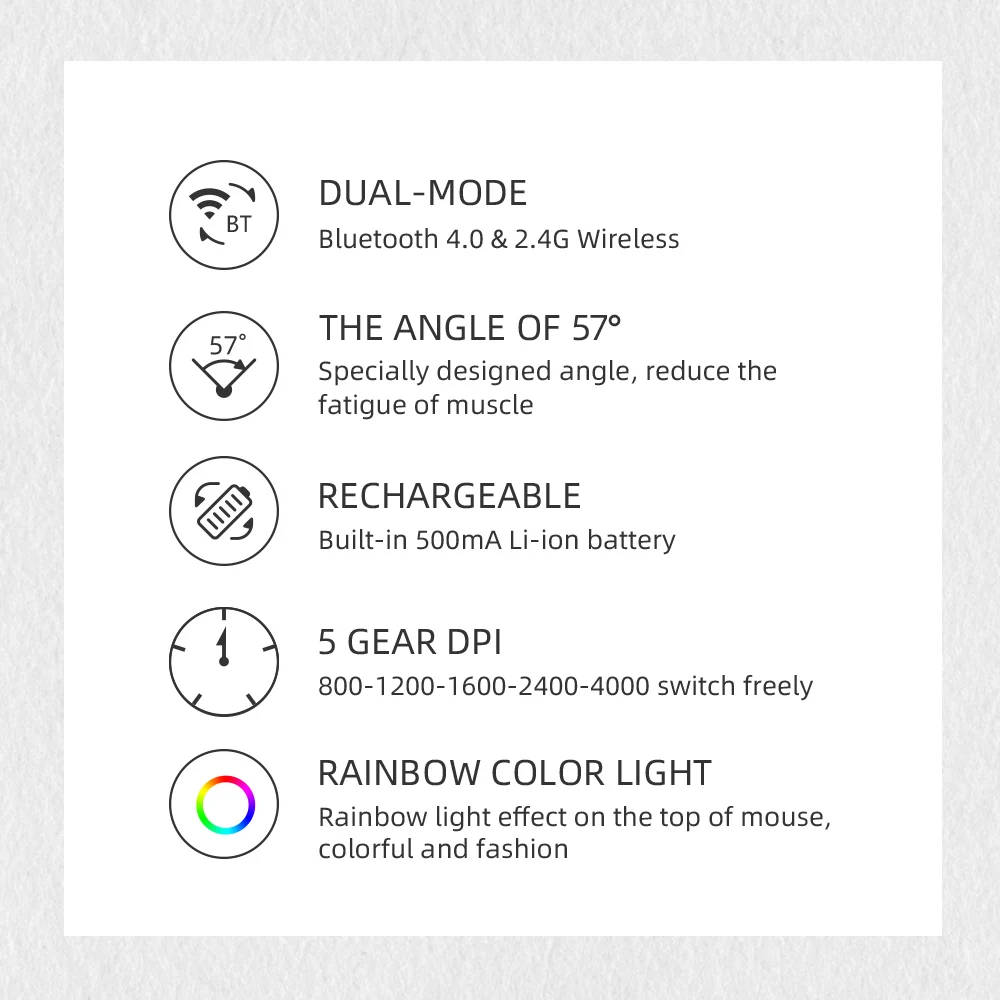 Build up the connection via BT4.0 and USB receiver, stable connection, plug and play. And easy switch the connection mode between 2.4G wireless and BT by clicking the little dot in the mouse bottom.