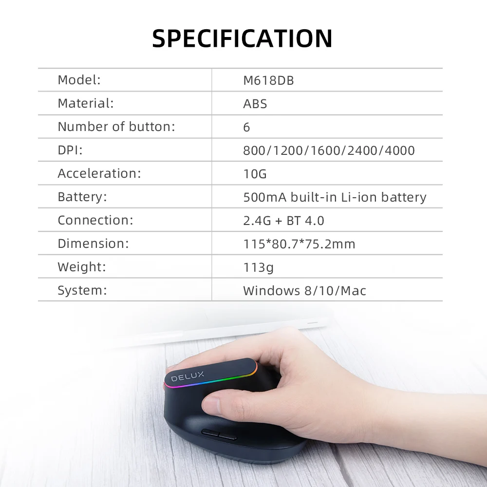Just hold the DELUX vertical mouse with a scientific angle-57 degree, rest your hand in the mouse and keep your forearm muscle under natural position. Compared with the tradition-shaped mouse, reduce arm discomfort and hand stiffness.