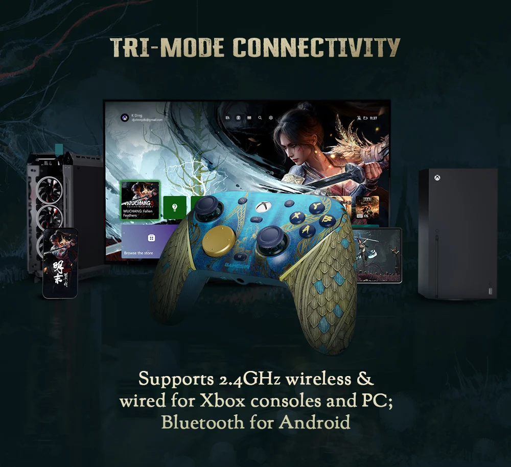 GameSir’s first wireless controller for Xbox is here. In official collaboration with Wuchang: Fallen Feathers, this wireless version of the G7 Pro carries forward all the pro-grade features of the original - advanced TMR sticks, Hall Effect analog triggers with clicky Micro Switch trigger stops, four remappable buttons, and more. Now with full 2.4G wireless support for Xbox consoles, offering both wired and wireless flexibility.