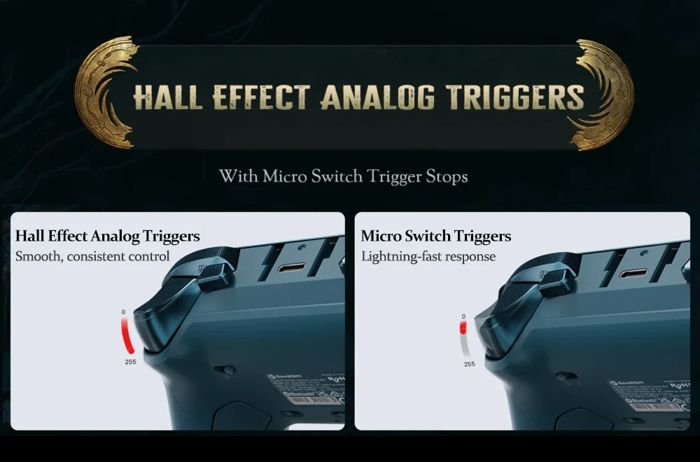 Triggers: Hall Effect analog triggers with Micro Switch trigger stops
