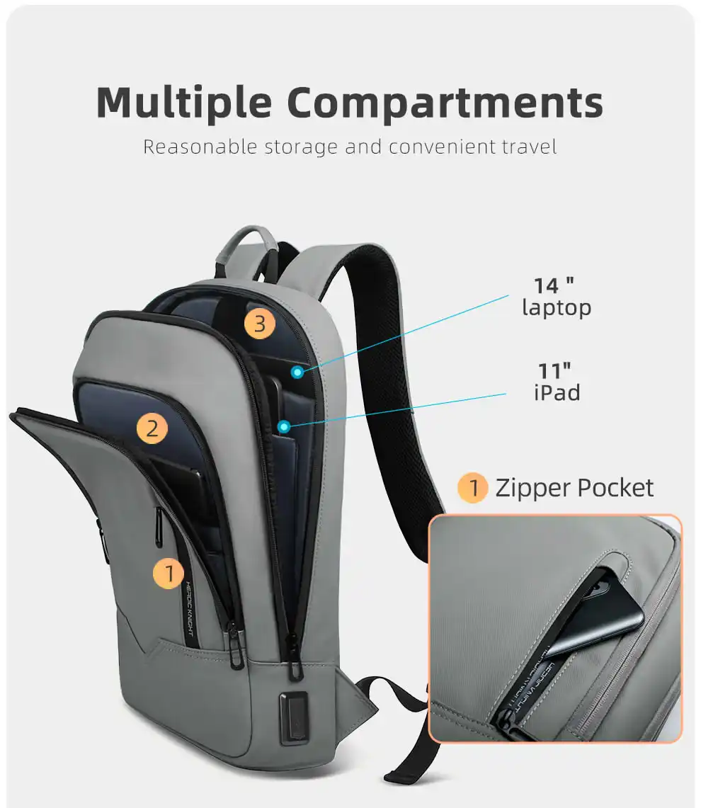 The large capacity backpack with many compartments, reasonable storage. It has two computer compartment, holding 14-inch laptop and 11-inch ipad.