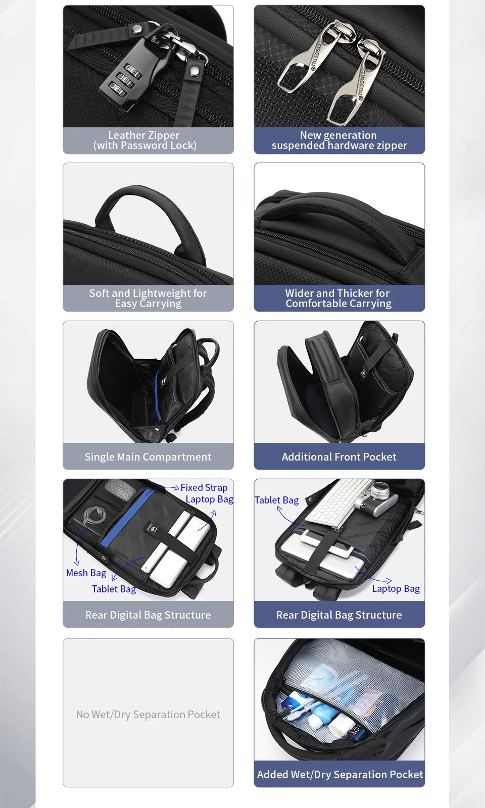 Classic Version Features: Brand Suspended Design Zipper; Expandable; Waterproof; 180° Omni-directional View; Curved shoulder strap; Breathable back cushion; Hard sell